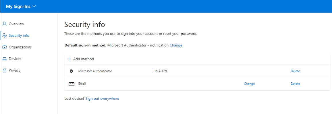 WICHTIG! Wenn es nur ein Admin-Konto gibt, unbedingt vorab prüfen ob die alten Authentifizierungsmethoden noch vorhanden sind! Dazu mit dem Admin-Konto anmelden und in die Benutzereinstellungen wechseln oder den folgenden Link aufrufen: https://mysignins.microsoft.com/security-info.